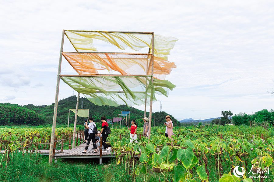 Decorated by fabrics dyed in a brilliant range of natural colors derived from crop waste, Youxi village in Luanfeng township, Guangze county, Nanping city, east China's Fujian province, has recently been turned into an exquisite art gallery, drawing large crowds of tourists.