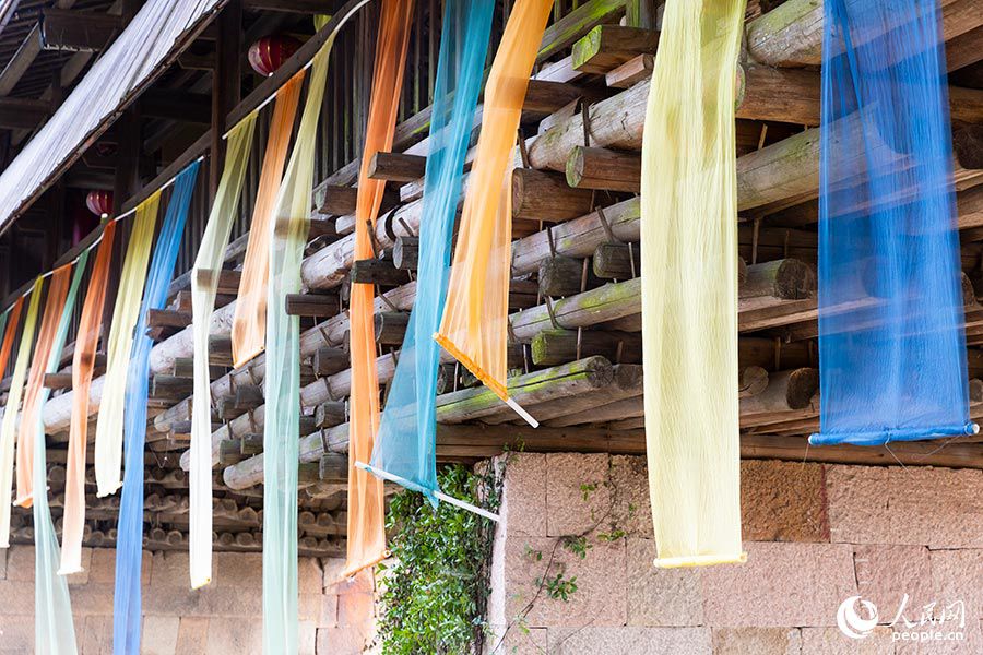 Decorated by fabrics dyed in a brilliant range of natural colors derived from crop waste, Youxi village in Luanfeng township, Guangze county, Nanping city, east China's Fujian province, has recently been turned into an exquisite art gallery, drawing large crowds of tourists.