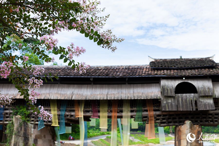 Decorated by fabrics dyed in a brilliant range of natural colors derived from crop waste, Youxi village in Luanfeng township, Guangze county, Nanping city, east China's Fujian province, has recently been turned into an exquisite art gallery, drawing large crowds of tourists.