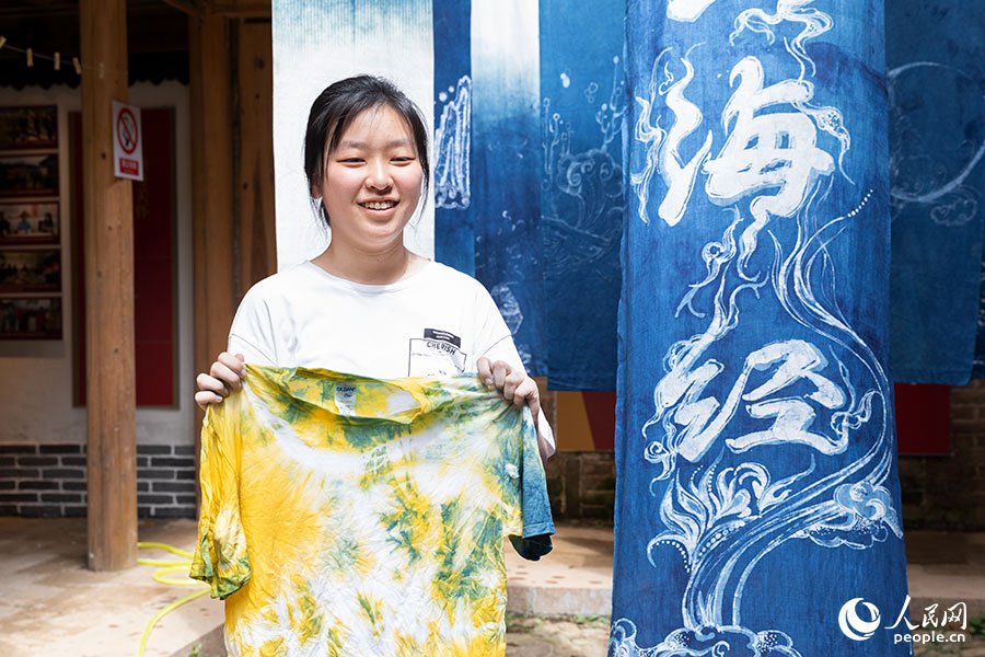 Photo shows a tourist showing off her T-shirt dyed in iridescent colors extracted from crop waste. (People’s Daily Online/Jiao Yan) |