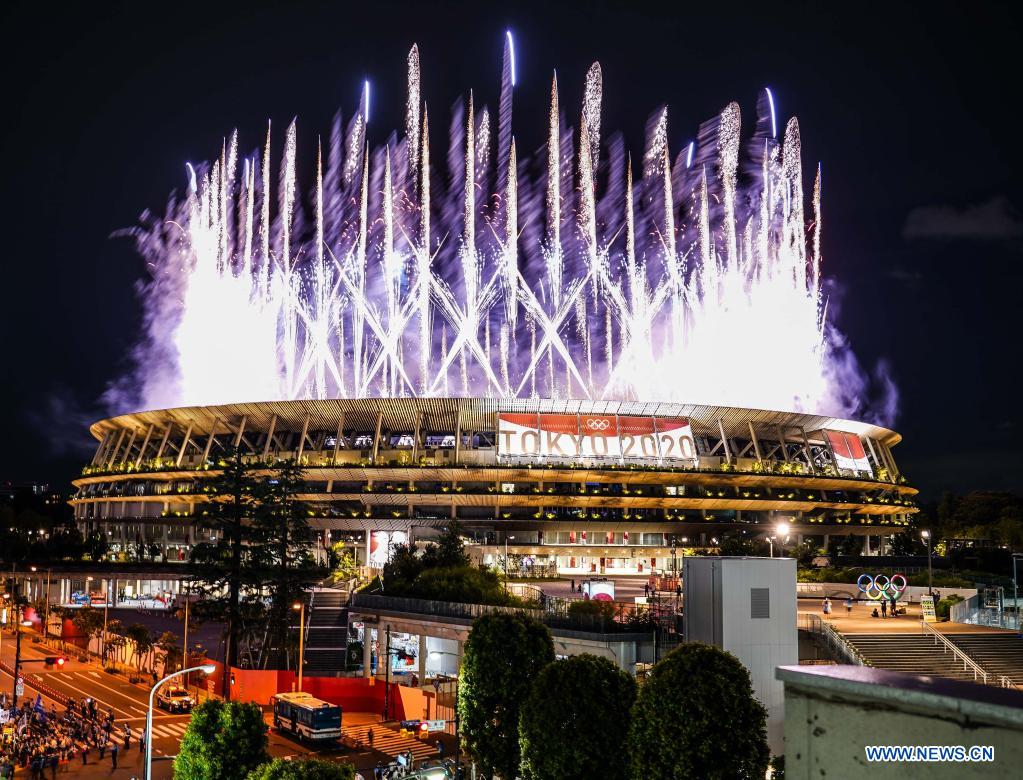 Fireworks explode over the Olympic Stadium during the opening ceremony of Tokyo 2020 Olympic Games in Tokyo, Japan, July 23, 2021. (Xinhua/Liu Dawei)