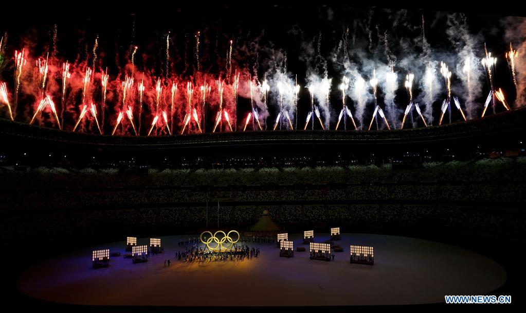 Fireworks explode over the Olympic Stadium during the opening ceremony of Tokyo 2020 Olympic Games in Tokyo, Japan, July 23, 2021. (Xinhua/Lui Siu Wai)