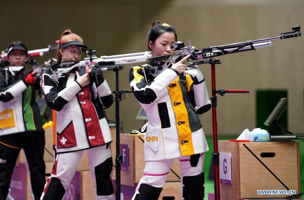 Yang Qian (R) of China competes during the Tokyo 2020 women's 10m air rifle final in Tokyo, Japan, July 24, 2021. (Xinhua/Ju Huanzong)
