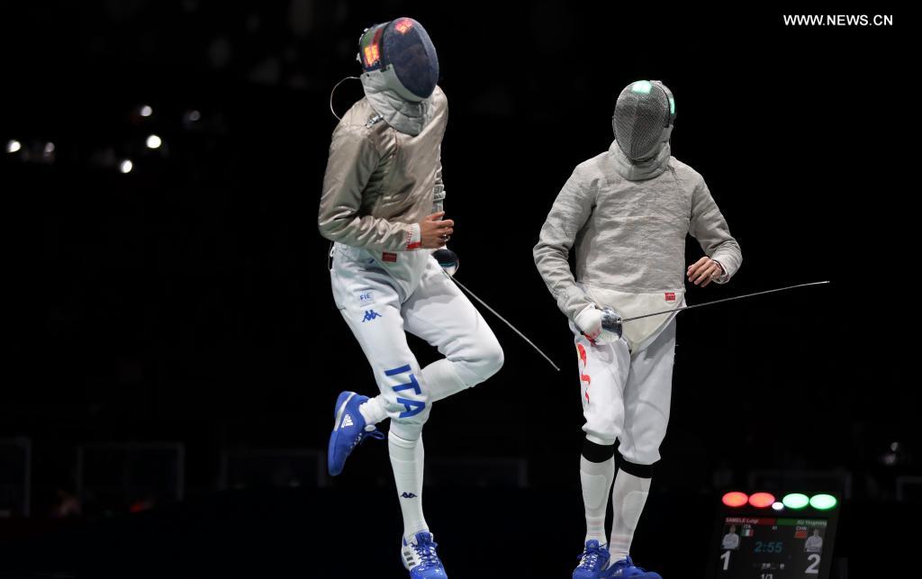 Italy's Luigi Samele (L) reacts after twisting his ankle during the men's Sabre Individual table of 32 at Tokyo 2020 Olympic Games in Tokyo, July 24, 2021. (Xinhua/Li Ming)