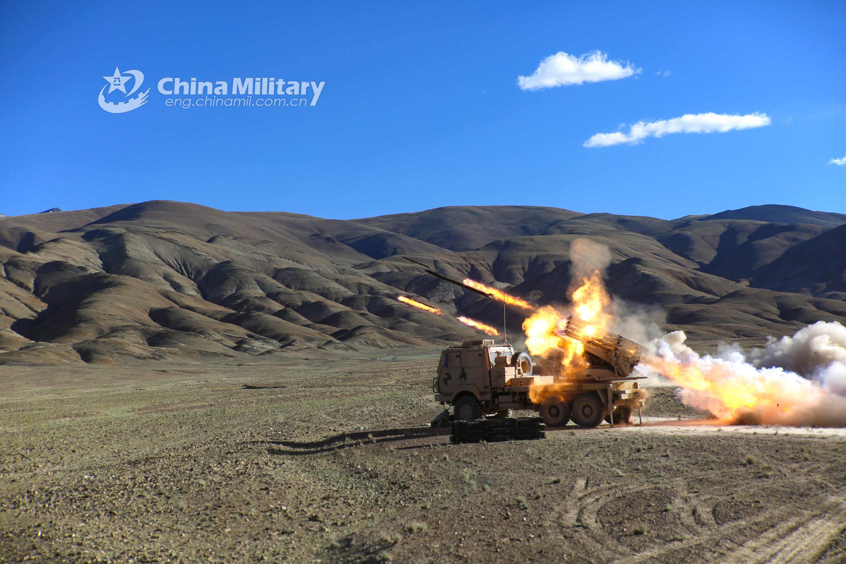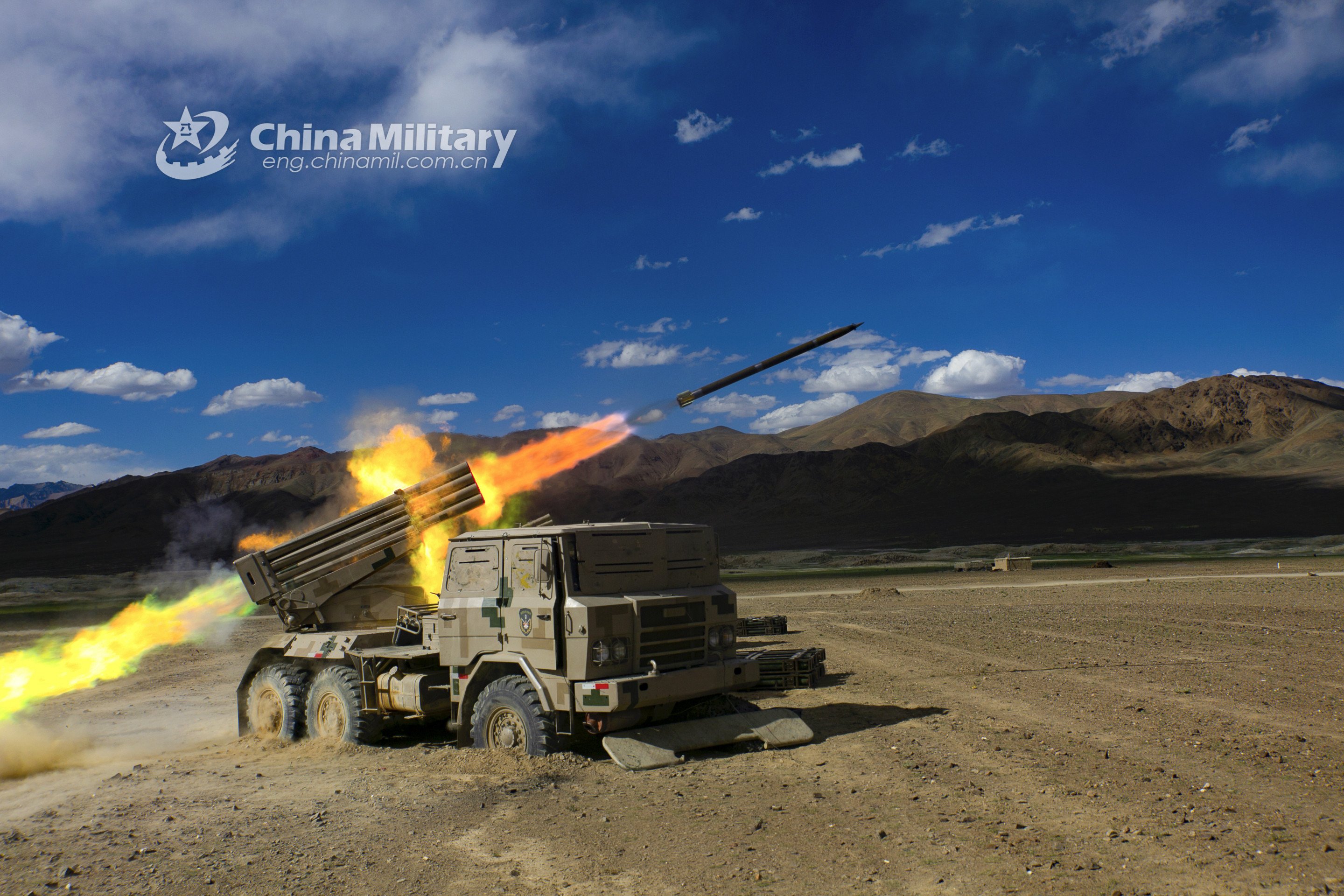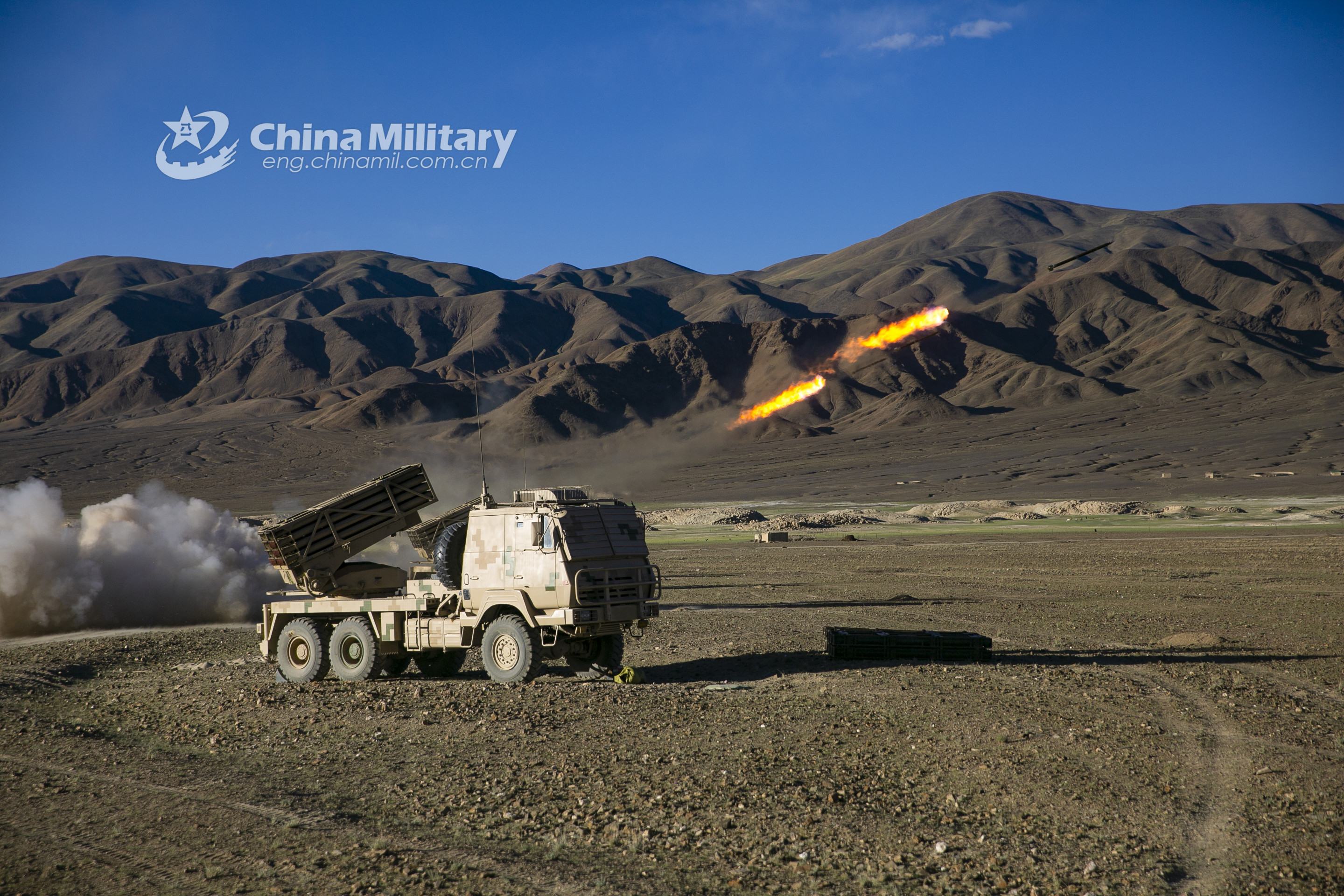 Long-range multiple launch rocket systems (LRMLRS) attached to an artillery detachment with a regiment under the PLA Army fire rockets during a live-fire training exercise in early July, 2021. (eng.chinamil.com.cn/Photo by Han Jiahang)