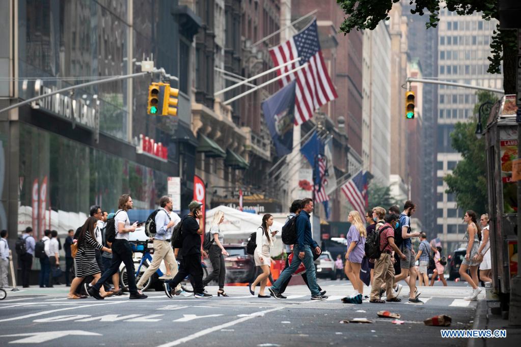 People walk on a street in New York, the United States, on July 20, 2021. COVID-19 cases and deaths are surging again in the United States as the highly transmissible Delta variant is taking hold and vaccination efforts are stagnating in the country. (Xinhua/Wang Ying)