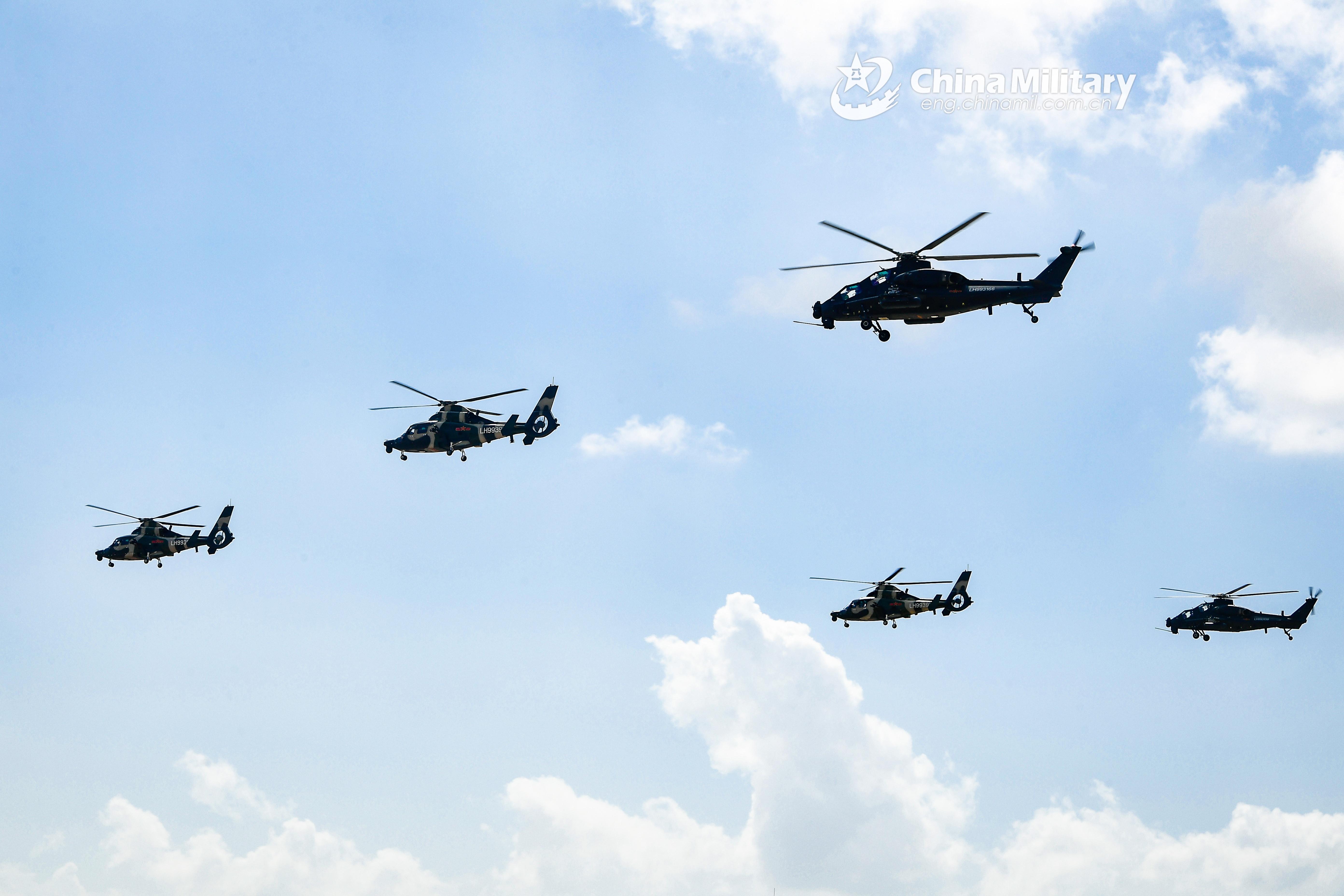 Multi-type attack and transport helicopters attached to an army aviation brigade under the PLA 73rd Group Army fly in formation during a flight training exercise. The training exercise mainly focused on such subjects as ultra-low altitude formation attack, concealment and defense penetration, as well as weapon-using escort. (eng.chinamil.com.cn/Photo by Li Shilong)