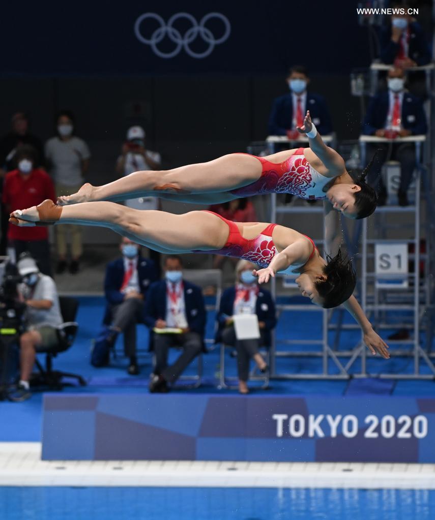 Shi Tingmao (front) and Wang Han of China compete during the women's synchronised 3m springboard final of diving at Tokyo 2020 Olympic Games in Tokyo, Japan, July 25, 2021. (Xinhua/Wang Jingqiang)
