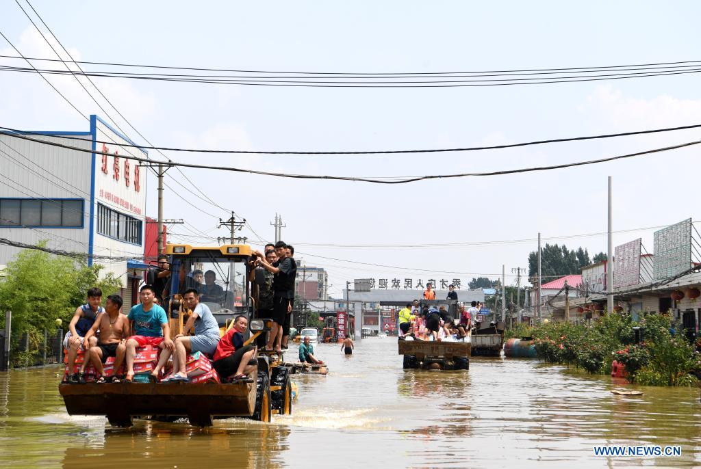 Stranded residents are evacuated on shovel loaders in flood-hit Xinxiang City, central China's Henan Province, July 24, 2021. (Xinhua/Hao Yuan)