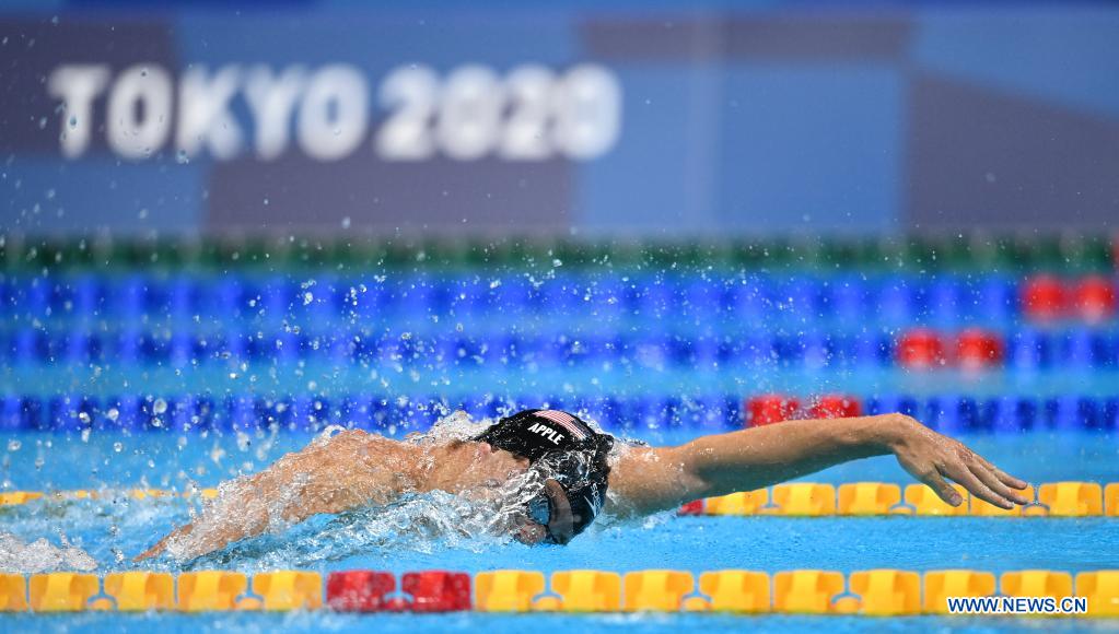 Zach Apple of the United States competes during the men's 4x100m freestyle relay final at the Tokyo 2020 Olympic Games in Tokyo, Japan, on July 26, 2021. (Xinhua/Xia Yifang)