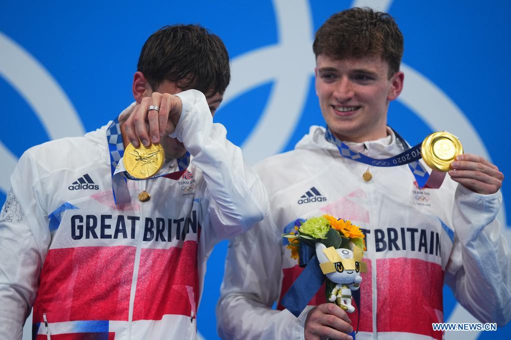 Thomas Daley (L) wipes tears at the awarding ceremony of the men's synchronised 10m platform of diving at Tokyo 2020 Olympic Games in Tokyo, Japan, July 26, 2021. (Xinhua/Xu Chang)