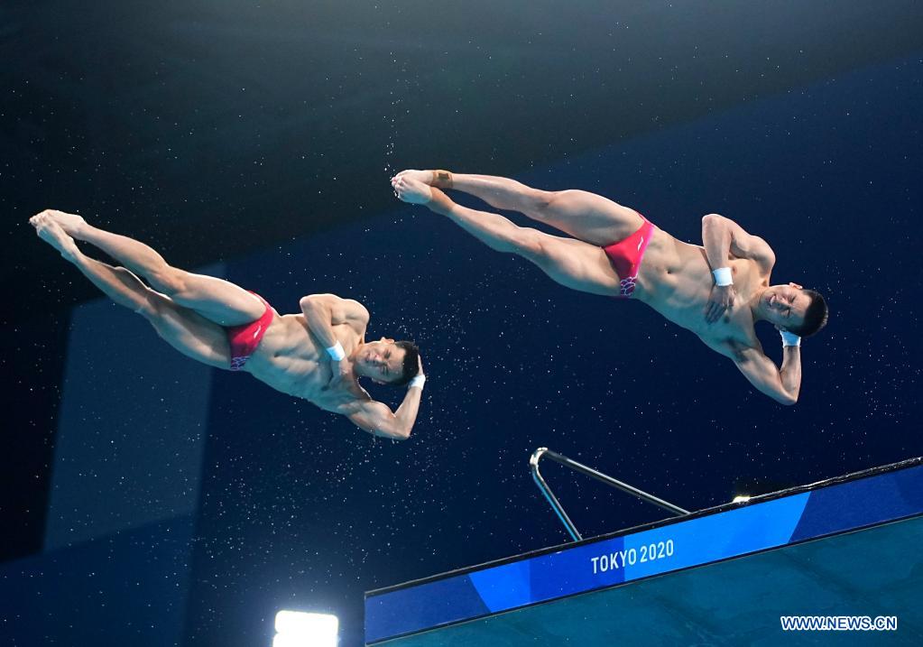 Cao Yuan and Chen Aisen of China compete during the men's synchronised 10m platform final of diving at Tokyo 2020 Olympic Games in Tokyo, Japan, July 26, 2021. (Xinhua/Xu Chang)