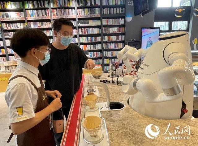 Chen Xiaolong (right), a post-90s technician who specializes on human-computer interaction and is responsible for the deployment of robots, instructs a robot in making coffee through AI learning, body and visual training. (Photo by Xu Weina/ People's Daily Online)