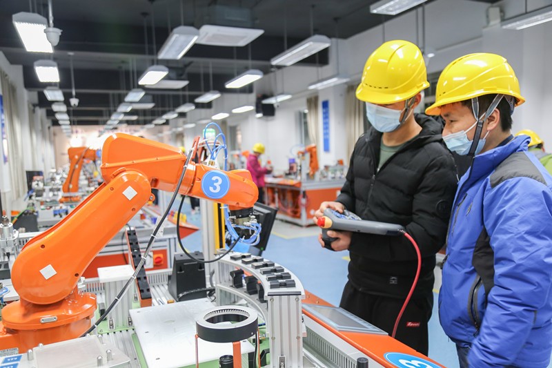 Photo shows trainees are learning to control industrial robot during a training course on industrial robot operation and maintenance. The first session of the training course kicked off at the Xinqiao vocational school in Songjiang district, Shanghai, on March 7, 2021, involving a total of 40 trainees. (Photo by Jiang Huihui/ People's Daily Online)