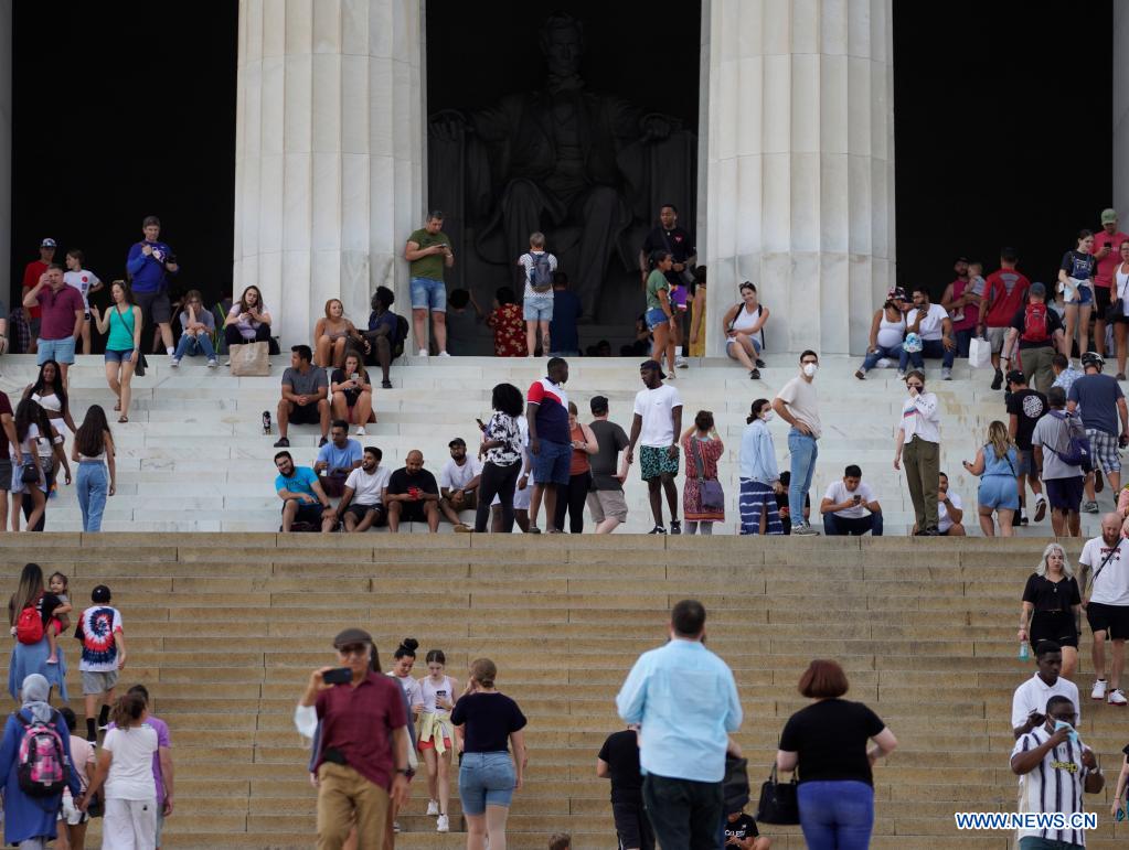People visit the Lincoln Memorial at the National Mall in Washington D.C., the United States, on July 24, 2021. The current COVID-19 surge in the United States will steadily accelerate through this summer and fall, an article published by the U.S. non-profit media organization National Public Radio (NPR) has said. (Photo by Ting Shen/Xinhua)