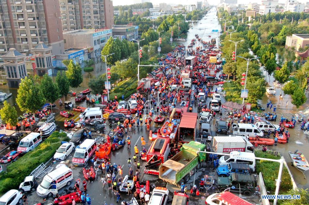 Aerial photo taken on July 26, 2021 shows the rescue scene outside the First Affiliated Hospital of Xinxiang Medical University in Weihui, Xinxiang City of central China's Henan Province. Weihui is suffering from serious flooding caused by heavy downpours in the past few days. Rescuers and volunteers gather at the power-disrupted First Affiliated Hospital of Xinxiang Medical University to transfer patients to safe areas. (Xinhua/Hao Yuan)