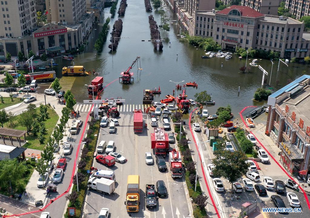 Aerial photo shows rescuers pumping rainwater out of a road in the waterlogged urban area of Weihui City, central China's Henan Province, July 27, 2021. Weihui City suffered from severe urban waterlogging due to the extremely heavy rainfall. (Xinhua/Li An)