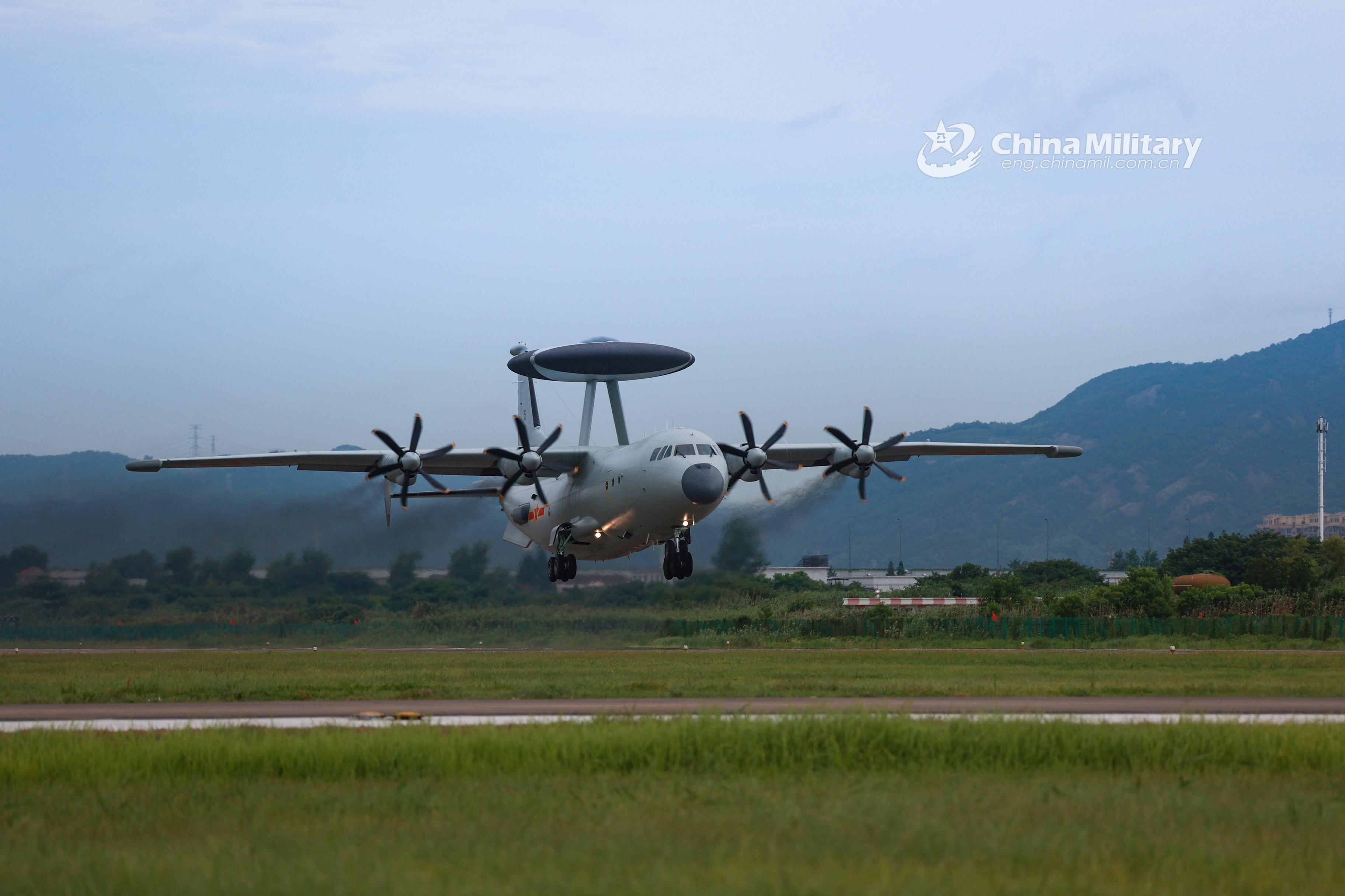An airborne early warning (AEW) aircraft attached to a naval aviation division under the PLA Eastern Theater Command spins its propellers and takes off for a maritime flight training exercise on July 17, 2021. (eng.chinamil.com.cn/Photo by Yu Mingzhe)