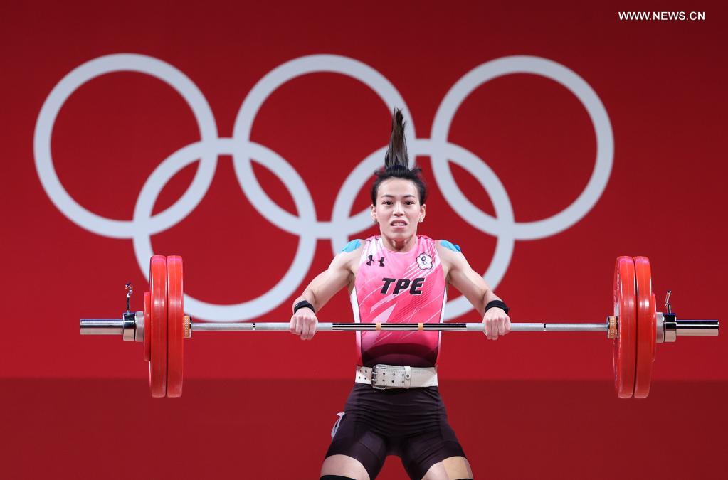 Kuo Hsing-Chun of Chinese Taipei competes during the women's 59kg weightlifting final match at the Tokyo 2020 Olympic Games in Tokyo, Japan, July 27, 2021. (Xinhua/Yang Lei)
