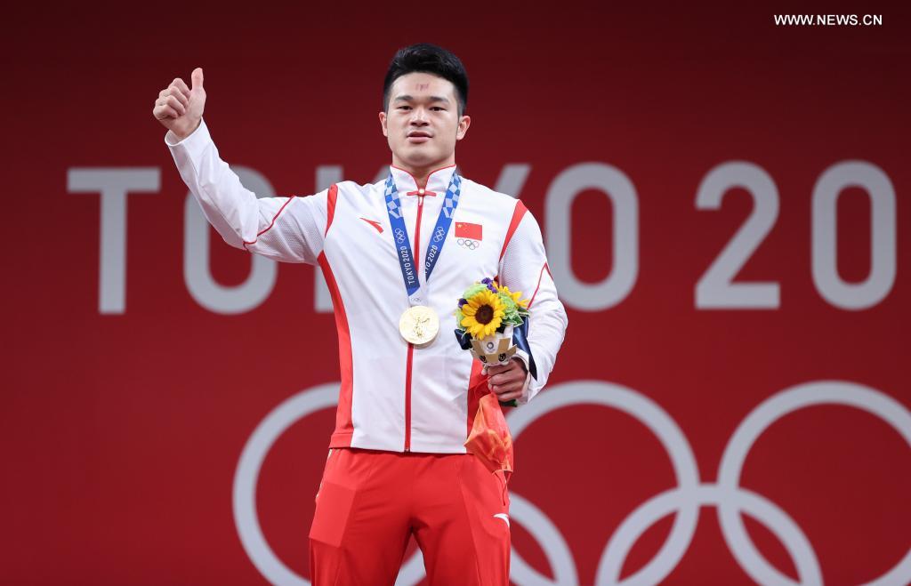 Shi Zhiyong of China attends the awarding ceremony of the men's 73kg weightlifting event of the Tokyo 2020 Olympic Games in Tokyo, Japan, July 28, 2021. (Xinhua/Yang Lei)
