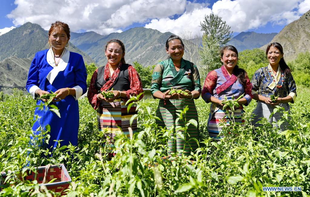 Farmers show newly-harvested peppers in Guncun Village in Nyingchi, southwest China's Tibet Autonomous Region, July 27, 2020. Nyingchi is located in the lower reaches of the Yarlung Zangbo River. With an average elevation of 3,100 meters, Nyingchi has one of the most well-protected virgin forests in China, with a forest coverage rate of 53.6 percent. In the past five years, Nyingchi has received 32 million tourists and made a tourism revenue of over 24 billion yuan (about 3.69 billion U.S. dollars). (Xinhua/Zhang Rufeng)