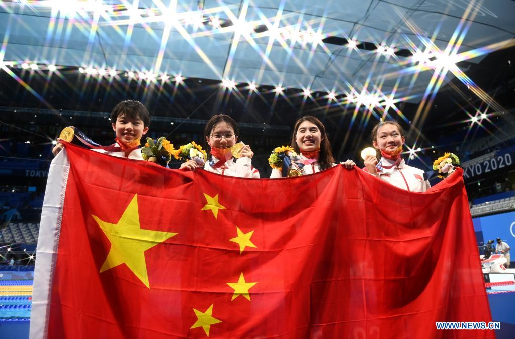 Yang Junxuan, Tang Muhan, Zhang Yufei and Li Bingjie (from L to R) of China pose for photos after the awarding ceremony of the women's 4x200m freestyle relay final of swimming at the Tokyo 2020 Olympic Games in Tokyo, Japan, July 29, 2021. (Xinhua/Xia Yifang)