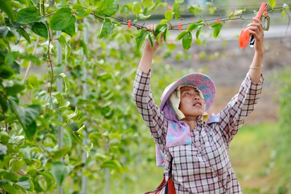 A farmer in Longtu village, Guandong township, Congjiang county, southwest China’s Guizhou province, fixes branches of passion fruit trees at a planting base, July 22, 2021. (Photo by Lu Zhongnan/People’s Daily Online)