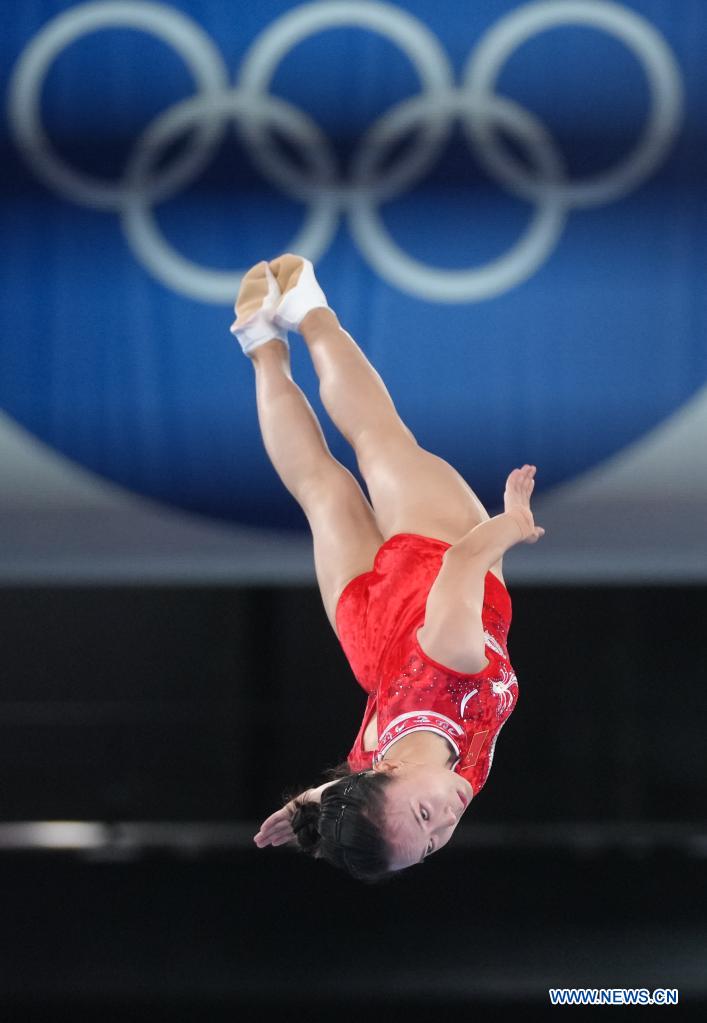 Zhu Xueying of China competes during the women's final of trampoline gymnastics at the Tokyo 2020 Olympic Games in Tokyo, Japan, July 30, 2021. (Xinhua/Cheng Min)
