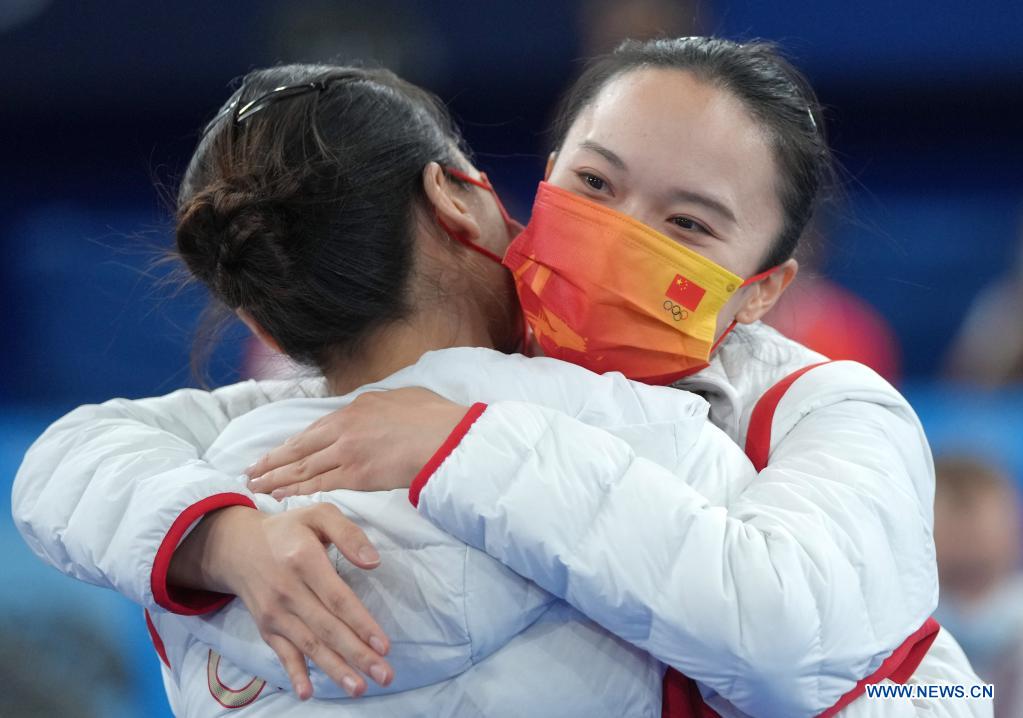 Zhu Xueying (R) of China hugs teammate Liu Lingling during the women's final of trampoline gymnastics at the Tokyo 2020 Olympic Games in Tokyo, Japan, July 30, 2021. (Xinhua/Cheng Min)