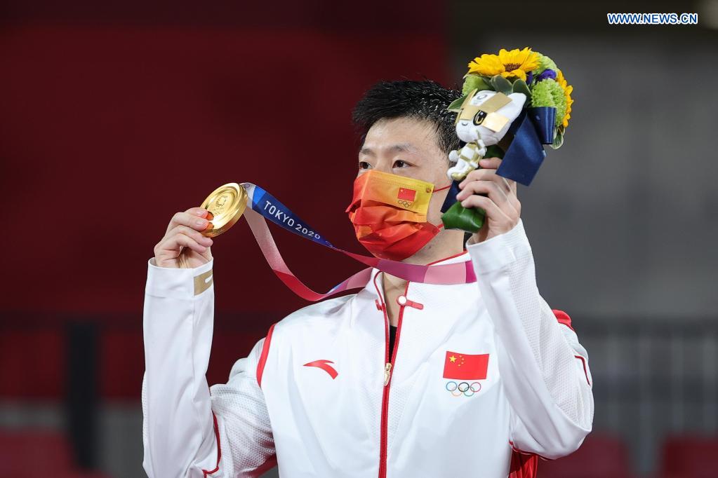 China's Ma Long shows his gold medal during the awarding ceremony of the men's singles match of table tennis at Tokyo 2020 Olympic Games in Tokyo, Japan, July 30, 2021. (Xinhua/Wang Dongzhen)
