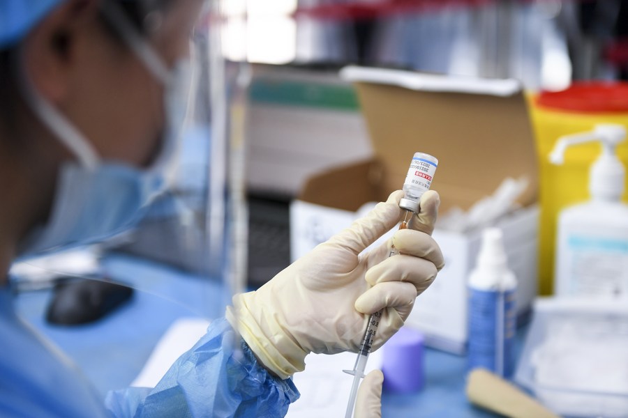 A medical worker prepares a dose of COVID-19 vaccine at a high school in Shenzhen, south China's Guangdong Province, July 29, 2021. (Xinhua/Mao Siqian)