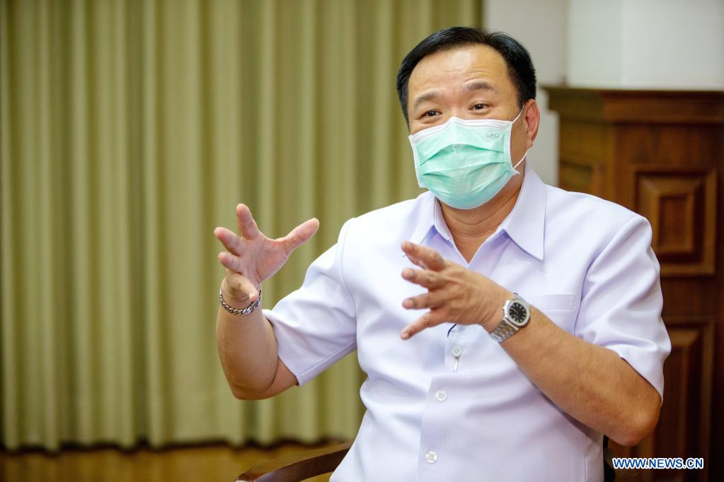 Thai Deputy Prime Minister Anutin Charnvirakul speaks during an interview in Bangkok, Thailand, on July 29, 2021. Anutin Charnvirakul said China and Thailand have had good cooperation on fighting the COVID-19 pandemic and the two countries will continue to support each other in this regard. (Xinhua/Wang Teng)