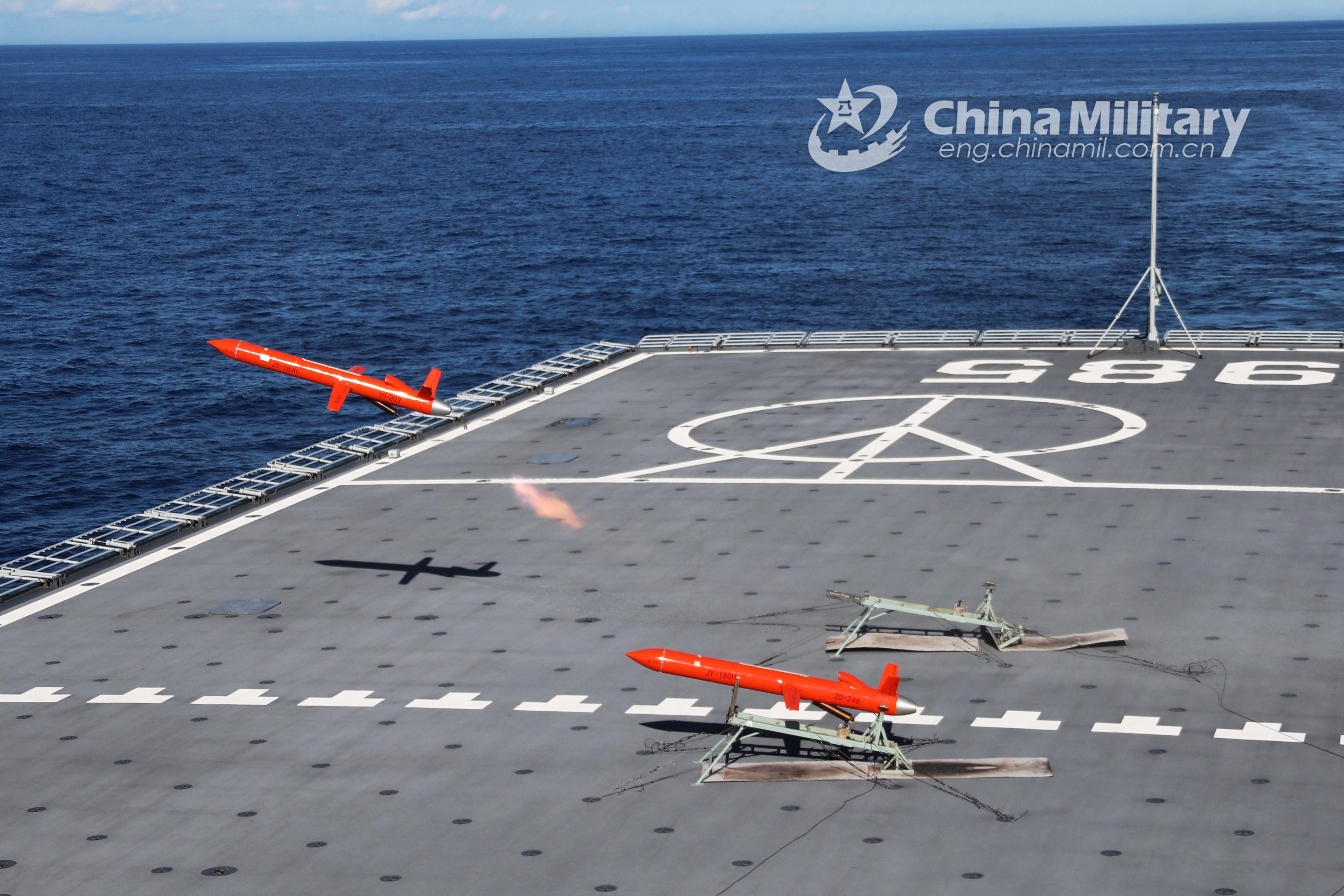 Super-speed target drones attached to a landing ship flotilla with the navy under the PLA Southern Theater Command take off from the flight deck of the amphibious dock landing ship Qilianshan (Hull 985) during a maritime realistic training exercise in waters of the South China Sea in mid July, 2021. (eng.chinamil.com.cn/Photo by Qiao Chenxi)