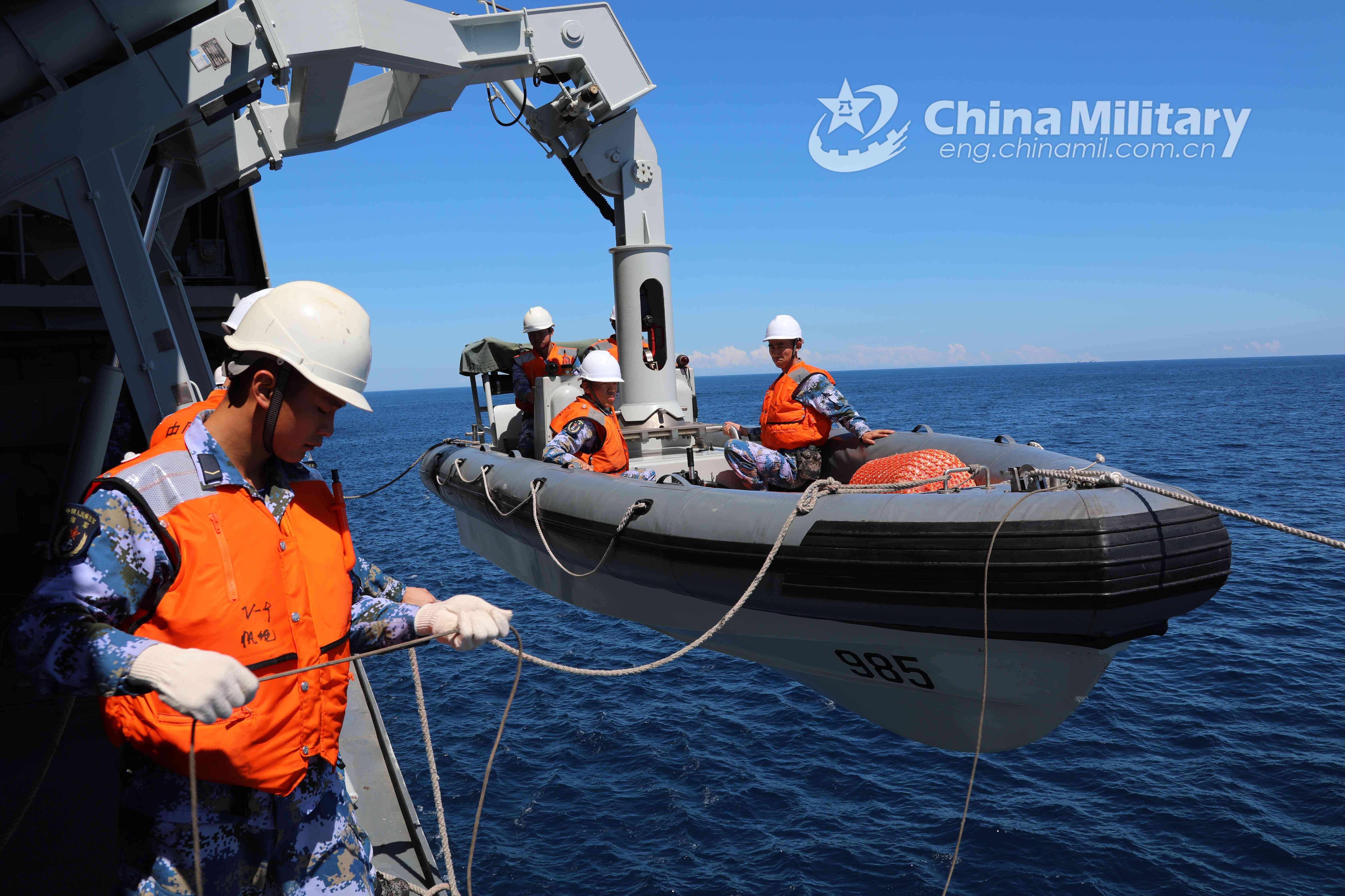 Sailors aboard the amphibious dock landing ship Qilianshan (Hull 985) lower a rigid-hull inflatable boat (RHIB) with a crane in preparation for a search and rescue mission during a maritime realistic training exercise in waters of the South China Sea in mid July, 2021. (eng.chinamil.com.cn/Photo by Qiao Chenxi)