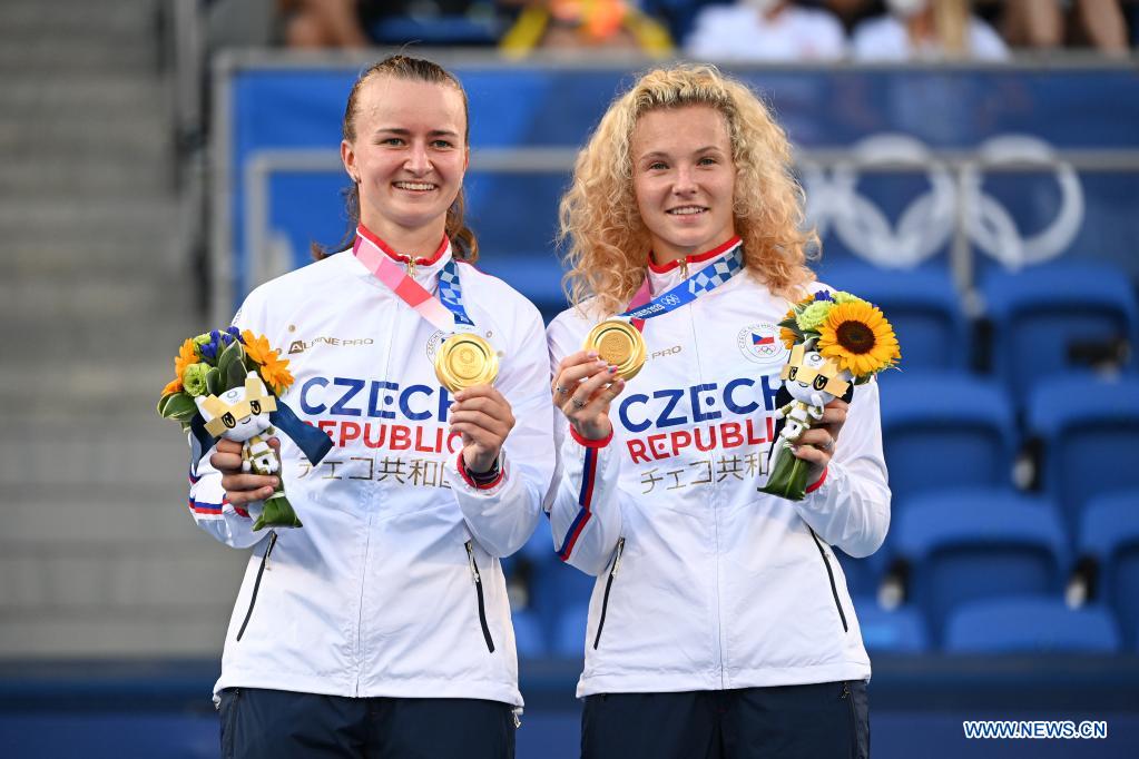 TOKYO, Aug. 1 (Xinhua) -- Barbora Krejcikova and Katerina Siniakova from the Czech Republic bagged the tennis women's doubles gold medal with a straight-set victory over Switzerland's Belinda Bencic and Viktorija Golubic at the Tokyo Olympic Games here on Sunday.
