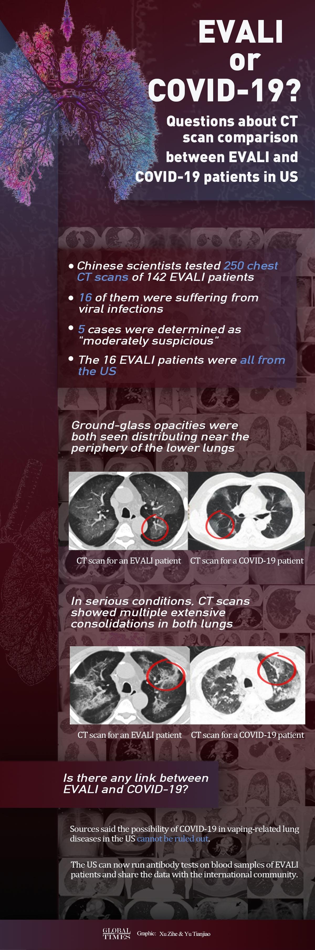 The Global Times learned from sources close to the matter on Saturday that after studying 250 chest CT scans of 142 EVALI patients selected from some 60 related studies that have been published, Chinese scientists found that 16 EVALI patients were involved in viral infections, which indicates that they could have had COVID-19. Five of the cases were determined as "moderately suspicious."
