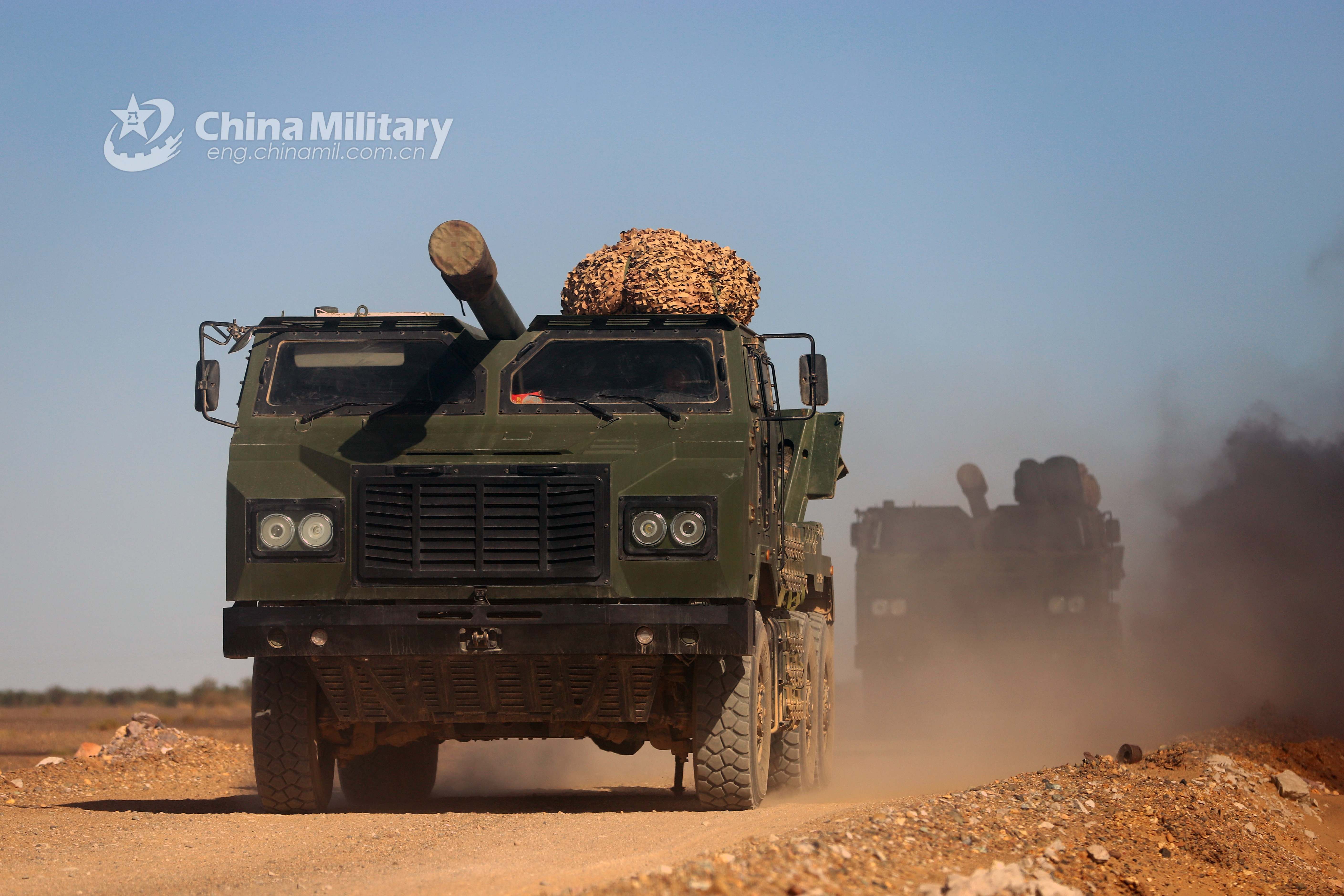A convoy of armed military trucks rumbles in speed through the simulated infected zone on unfamiliar territory during the integrated training exercise organized by an artillery brigade under the PLA 72nd Group Army on July 17, 2021. The exercise aimed to assess the troops’ operational adaptability in realistic combat scenario. (eng.chinamil.com.cn/Photo by Huang Baochuan)