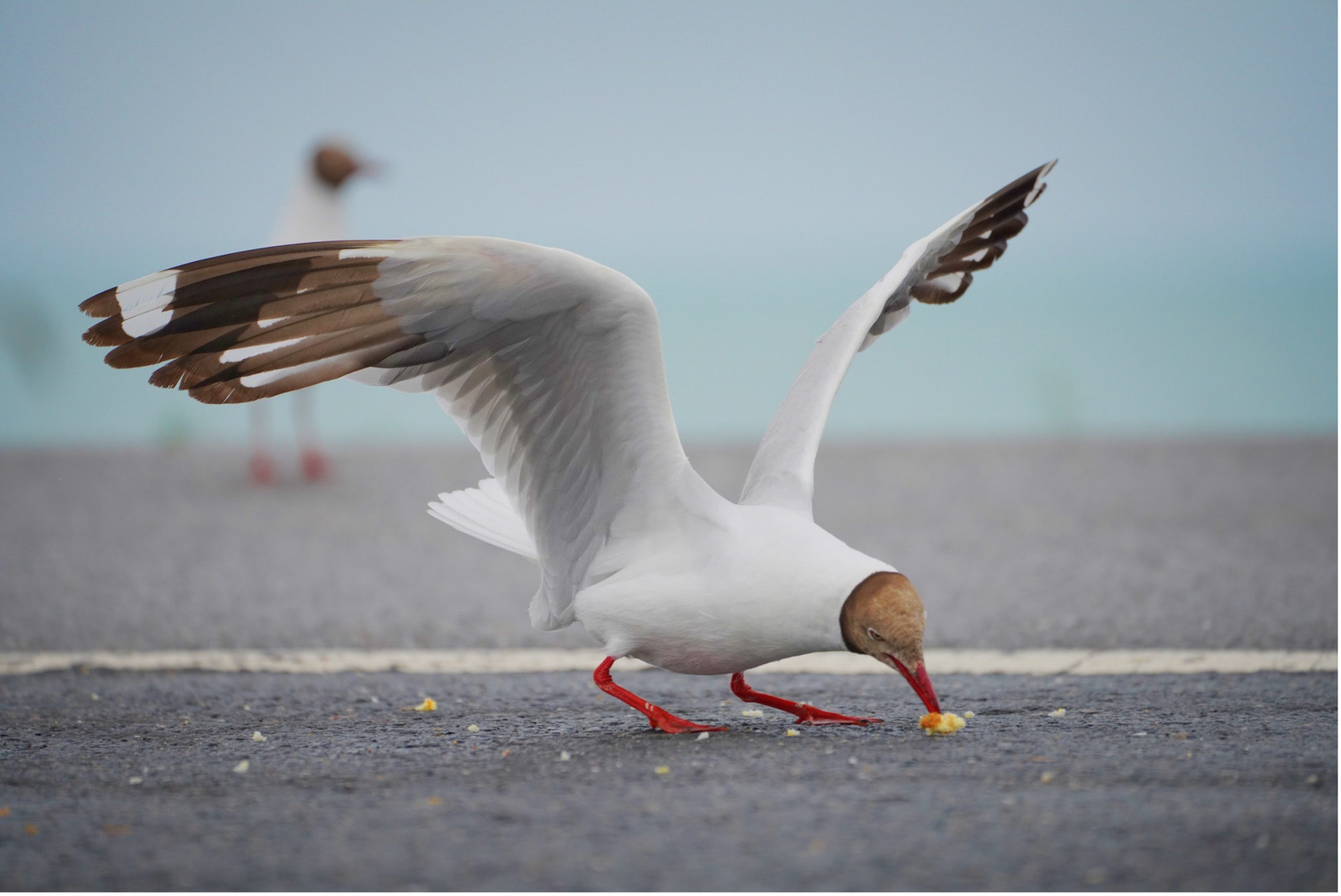 Photo taken on July 28, 2021 shows a seagull eating crumbs given by tourists along Qinghai Lake at Hainan Tibetan Autonomous Prefecture, northwest China’s Qinghai Province. (People’s Daily Online/Zhang Ruohan)