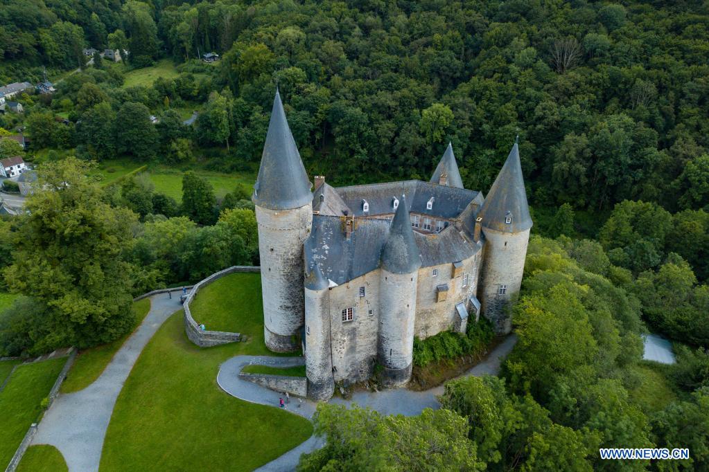 Aerial photo taken on Aug. 1, 2021 shows the Castle of Celles in Houyet, Belgium. The Castle of Celles, also known as the Castle de Veves, is one of the most remarkable specimens of 15th century military architecture. Destroyed in 1200 and rebuilt in 1230, the buildings burned down at the beginning of the 15th century and were restored after the fire. The castle remained a fortress until the end of the Middle Ages. (Xinhua/Zhang Cheng)