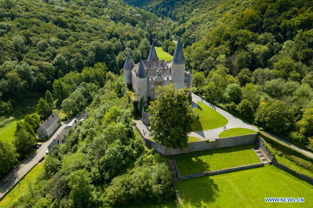Aerial photo taken on Aug. 1, 2021 shows the Castle of Celles in Houyet, Belgium. The Castle of Celles, also known as the Castle de Veves, is one of the most remarkable specimens of 15th century military architecture. Destroyed in 1200 and rebuilt in 1230, the buildings burned down at the beginning of the 15th century and were restored after the fire. The castle remained a fortress until the end of the Middle Ages. (Xinhua/Zhang Cheng)