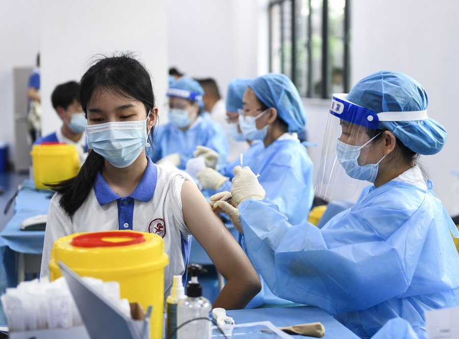 A medical worker administers a dose of COVID-19 vaccine for a student at a high school in Shenzhen, south China's Guangdong Province, July 29, 2021. (Xinhua/Mao Siqian)