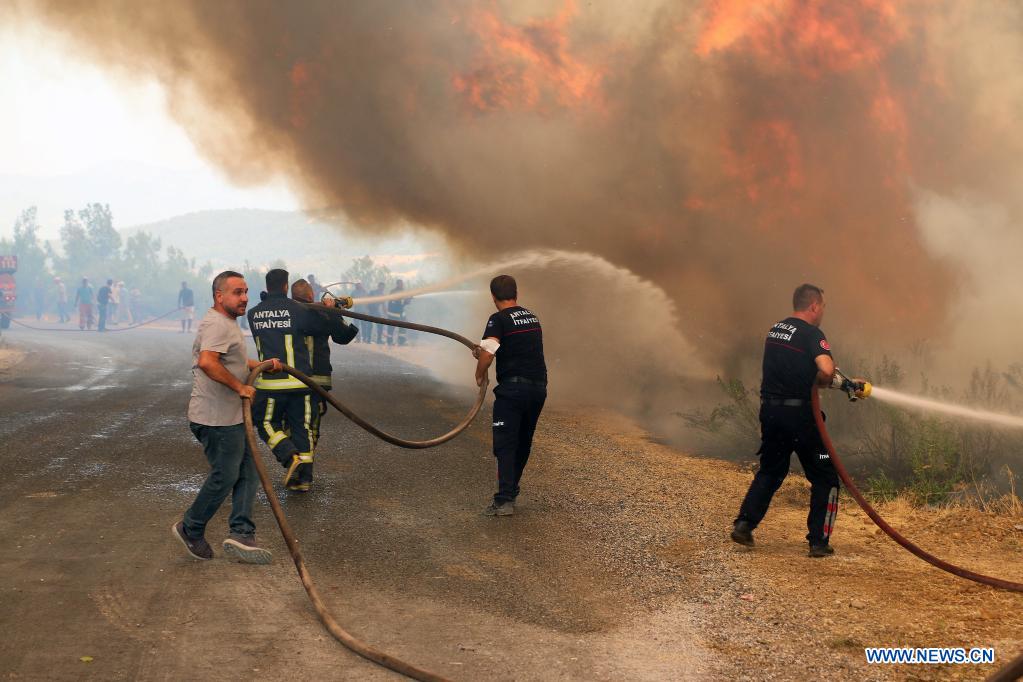 Firefighters and Local villagers battle against a wildfire in Manavgat, Antalya province, Turkey, on Aug. 3, 2021. For the last week, Turkey has been battling massive wildfires that erupted in the southern and southwestern coastal resort towns. The blazes have claimed eight lives so far. (Xinhua)