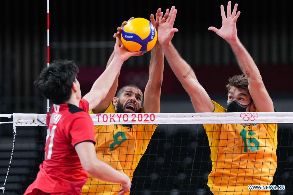 Brazil's Wallace de Souza (C) and Lucas Saaktamp block the ball during the men's quarterfinal of volleyball between Brazil and Japan at the Tokyo 2020 Olympic Games in Tokyo, Japan, Aug. 3, 2021. (Xinhua/Ju Huanzong)