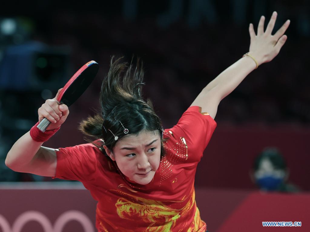 Chen Meng of China hits a return during the table tennis women's team semifinal between China and Germany at the Tokyo 2020 Olympic Games in Tokyo, Japan, Aug. 4, 2021. (Xinhua/Wang Dongzhen)