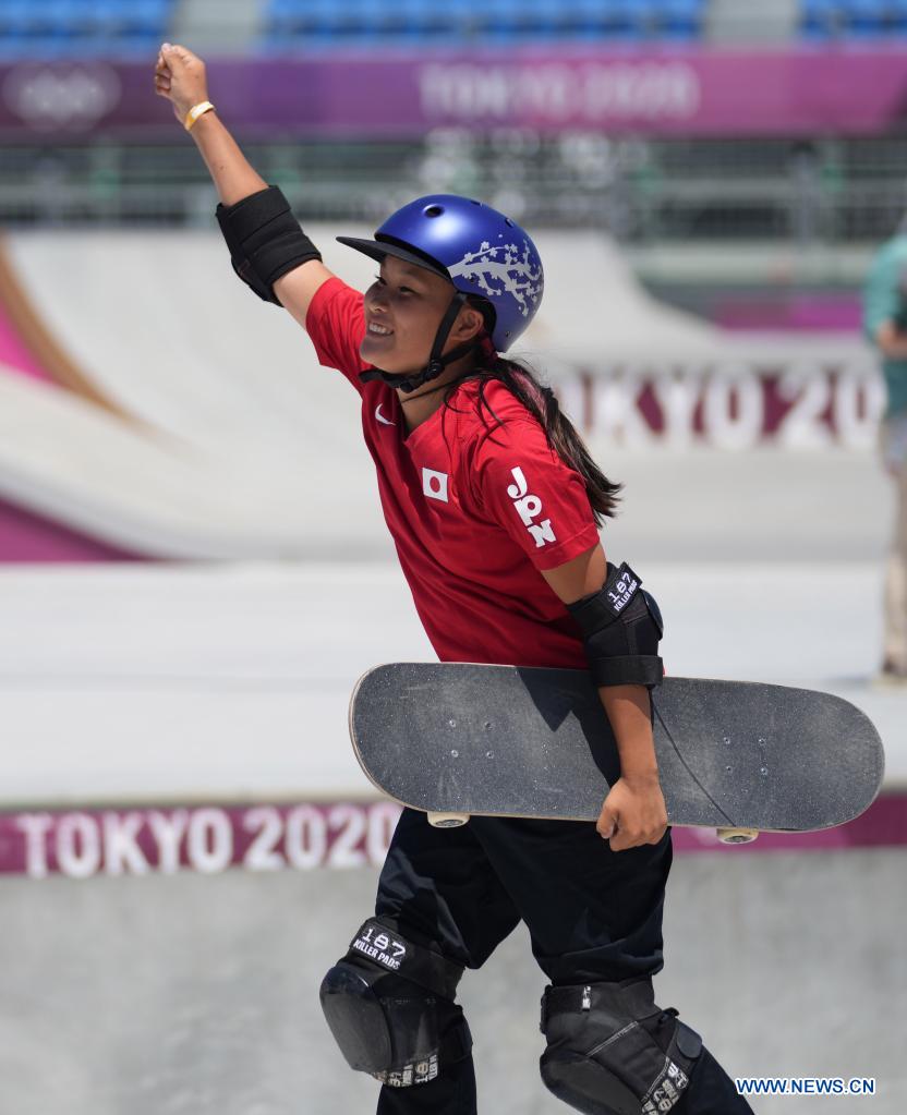 TOKYO, Aug. 4 (Xinhua) -- Sakura Yosozumi won the third skateboarding gold for Olympic hosts Japan in as many events with victory in the women's park final here on Wednesday.