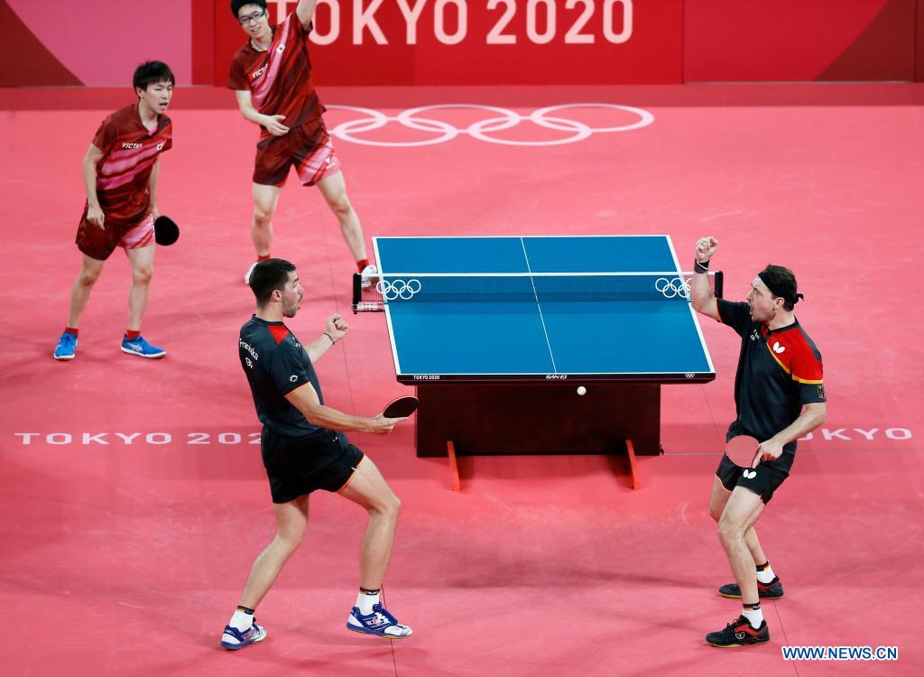 Patrick Franziska (L in bottom) /Timo Boll of Germany celebrate scoring during the table tennis men's team semifinal between Germany and Japan at the Tokyo 2020 Olympic Games in Tokyo, Japan, Aug. 4, 2021. (Xinhua/Wang Dongzhen)