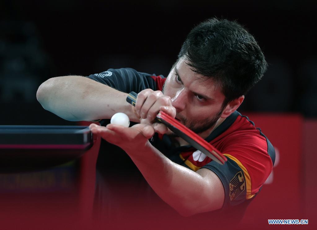 Germany's Dimitrij Ovtcharov serves during the table tennis men's team semifinal between Germany and Japan at the Tokyo 2020 Olympic Games in Tokyo, Japan, Aug. 4, 2021. (Xinhua/Wang Dongzhen)
