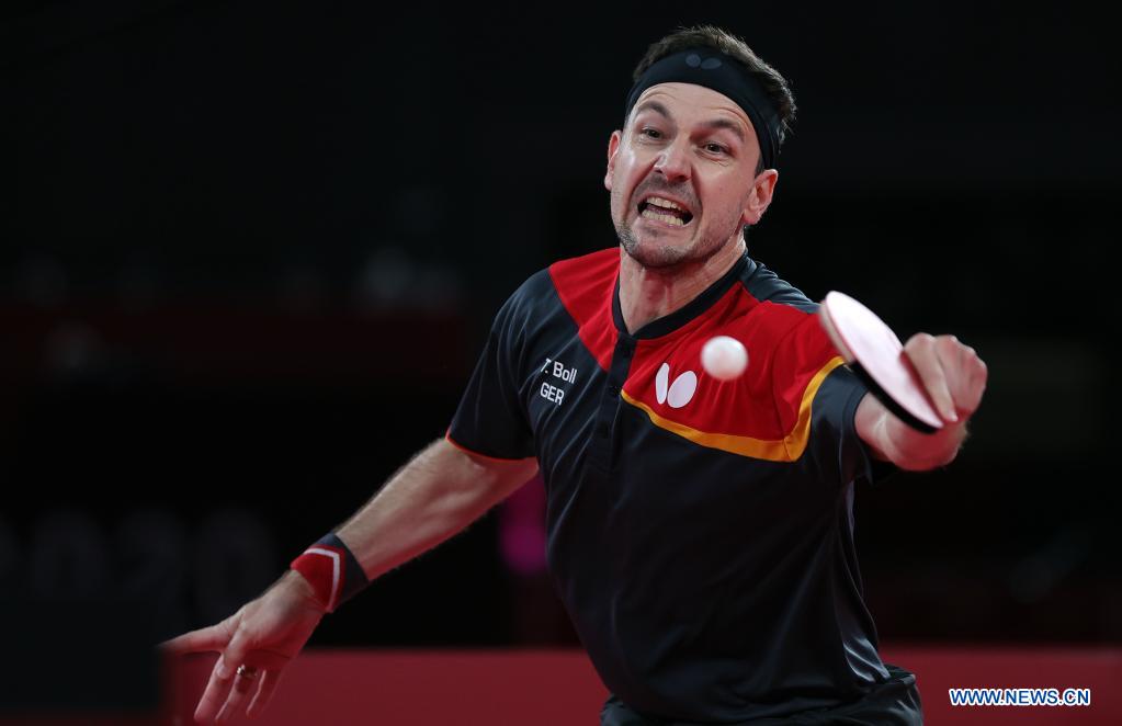 Germany's Timo Boll hits a return during the table tennis men's team semifinal between Germany and Japan at the Tokyo 2020 Olympic Games in Tokyo, Japan, Aug. 4, 2021. (Xinhua/Wang Dongzhen)