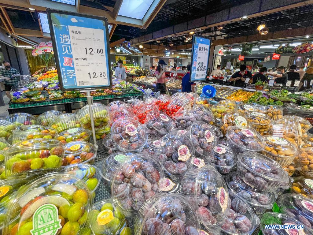 Citizens buy fruits at a supermarket in Yangzhou City, east China's Jiangsu Province, Aug. 4, 2021. During the prevention and control of the resurgence of COVID-19, Yangzhou has taken many measures to ensure the stability of daily necessaries supply. (Xinhua/Li Bo)