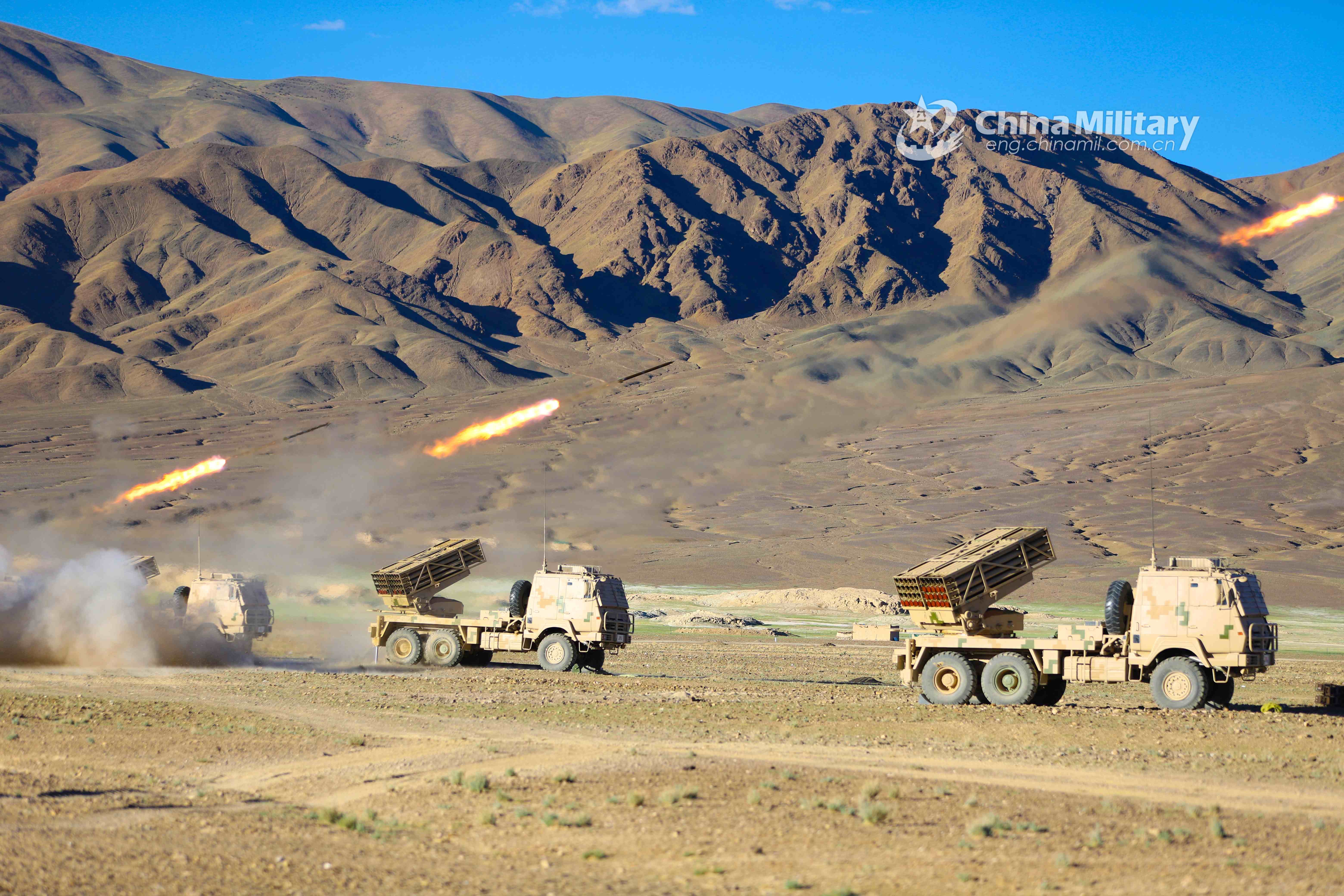 Truck-mounted long-range multiple launch rocket systems (LRMLRS) attached to an artillery detachment with a regiment under the PLA Army fire rockets at mock ground targets during a live-fire test in July of 2021. (eng.chinamil.com.cn/Photo by Xiang Xudong)